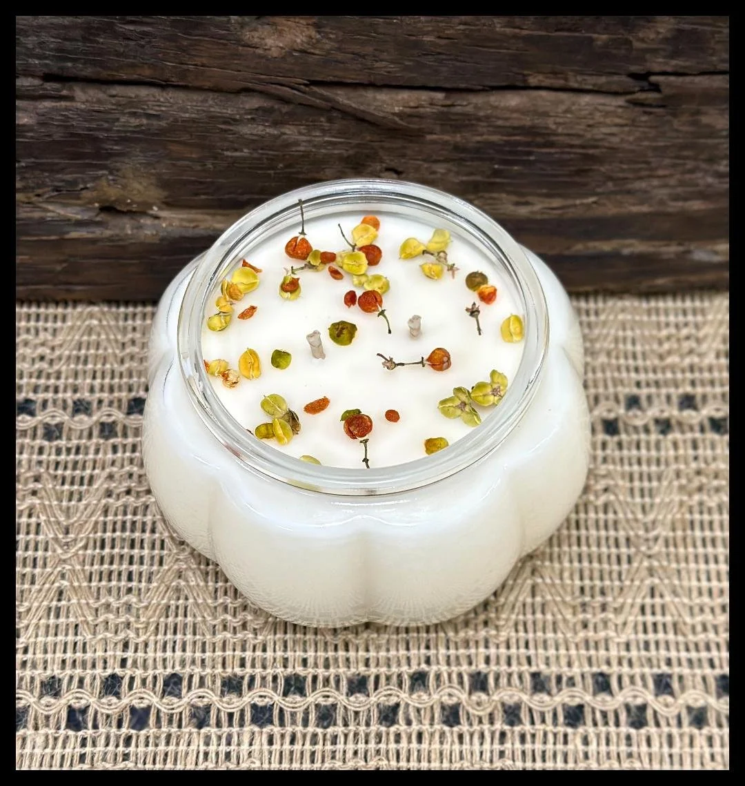 On your choice of black, clear or seasonal orange glass with a natural or fall floral candle top. These candles make great eco friendly hostess gifts.