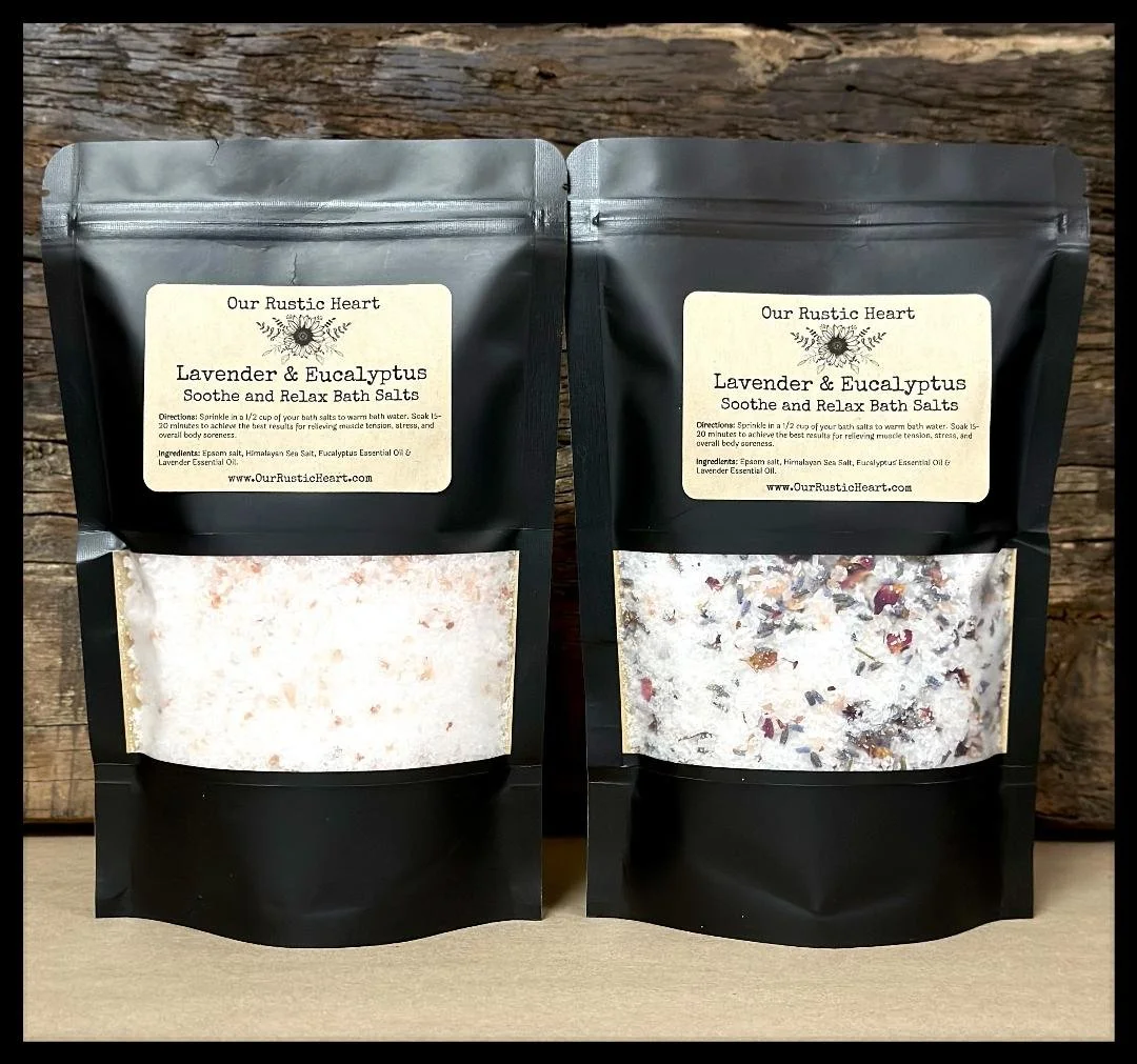 Our hand crafted Lavender & Eucalyptus Soothe and Relax Bath Salts will help bring relief to sore muscles, cramps and a fatigued body. Choose from (3) sizes!