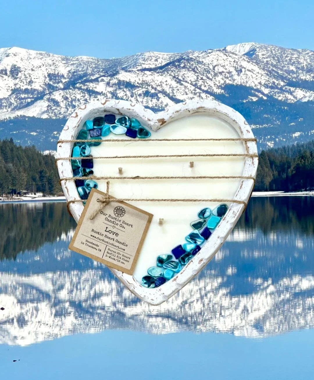 Our charming Lake Tahoe Blue Rustic Heart Candles make stunning statement piece candles.